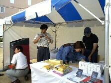 5時前になっていよいよ店仕舞いです。お店においてある決済器をコアラブースに集めてきて、電話につないで、今日の売り上げの集計を出しています。そして売上高を現金で協力して下さったお店にお渡しします。ハートの梅田さんも是永さんも真剣です。 | |
