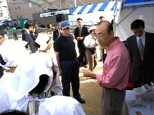 コアラブースに並んで10軒のお店が出ています。そのお店が全部、実験に参加して下さいます。おもちゃやさんと後は、全部食べ物のお店。やきとり、とりめし、石垣餅、ぜんざい、やせうま、などなどおいしい大分の郷土料理をいろんなボランテイアグループが出展しています。 そこの代表の方に集まってもらって、店頭決済器の使い方の説明をしている武本さんです。とっても熱心に聞いて下さっています。 |
