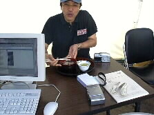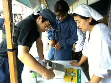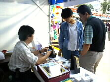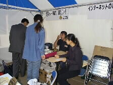コアラブースの面々も電子カードを持ってはお店に行って実験に協力をしています。私もいろんなものを買いました。そして食べました。尾野さんは食べかけるとお客さまが来られて、何を食べたのかわからないといいながら、今度はおぜんざいに挑戦です。 ここではインターネットも出来ますよ。 |