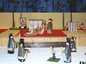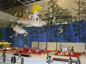 ![]() 月からの迎えがきて、別れを惜しむかぐや姫とおじいさん、おばあさんを中心に、平安絵巻きが繰り広げられます。 |