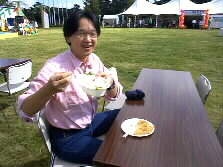 楽しいシンポジュームとネットワーカーズパーテイのプレゼントありがとうございました。アジアン屋台のメニューと共に、しばし別府の空気を楽しまれています。 |