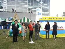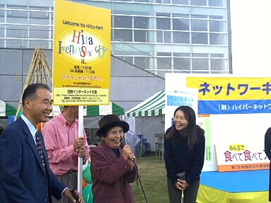 お昼前には平松大分県知事も会場へ。別府産業試験場の所長さんから竹製品の展示の説明を受けられる知事です。芝生広場では電子マネーにも大変興味を示されたとのことです。 |
