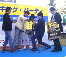 デジタルアニメファン待望のプレゼントコーナーです。3人のパネラーの方々が、サイン入りのポスターやビデオなどを持ってきて下さった。今、その抽選券を引いて下さっている所です。 左から掛須さん、石川さん、押井さん、森さん、そしてプレゼントのポスターを紹介している浜野さんです。ナントお手伝いをしていた、森さんもビデオが1巻当たり大喜びでした。 |