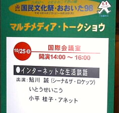 今日は、インターネットな生活談話」と題して鮎川誠、いとうせいこう、小平桂子・アネットの3氏によるマルチメデイア・トークショウがありました。3人3様のインターネットの使い方です。いずれにせよ、使うと決めた人が自分の責任で使うこと、自分の筋を持っていること、自己責任が大事、ということを言われていた、本当にそうだと思いました。 |