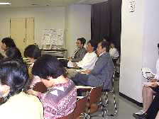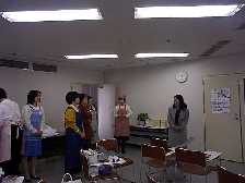 |  | まず、朝のミーテイングです。長い間かかって準備してきた家事家計講習会です。心を合わせて良い会にしましょうと、リーダーの挨拶です。みんなエプロンをつけて今から40分程でお客様を迎える準備です。 |