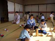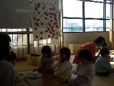 |    会場でお母さんたちが勉強をしている間、小さなお子さん達は隣りの和室で会員が託児をしました。元気にきたおしるしに葉っぱを貼り、かわいい名札を付けてもらって、小麦粉粘土や、積み木、紙芝居などでお友達と遊びました。11時過ぎには軽食を頂いてお母さんのお迎えを待ちました。 | |