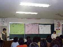 |   | 3才と1才の子供のいる吉山さんが、生活の様子を話しました。幼児の居る家庭では、幼児の食べる、寝る、という基本時間を大切に、暮らしたいことを話しました。そして幼児の食事の大切さに気付きいろいろと励んでいる様子は若いお母さんの共感を呼びました。 |