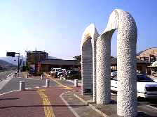 |  | 龍野から国道29号線を北上しました。途中、道の駅「新宮」がありました。大きな石の門が二つ、目印のモニュメントです。 |