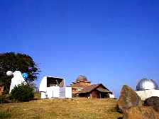 |  | ここには宿泊施設、観測施設などがあります。435mの山頂で芝生に寝転がるとまるい空に吸い込まれそうな気分のする素晴らしい所です。中央には60cmフォーク式反射望遠鏡を備えた展示室、研修室も備えた大きな天文台、前庭には小グループ用の小さな天文台3棟、それに太陽望遠鏡1基(写真の左端)が建っています。今月の17日の夜中から18日の明け方にかけてしし座大流星群が見られるということで大変関心のもたれている天文台です。 |