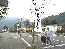 |  | 夕暮れになってきました。山をおりて帰途につきました。佐用から、千種川に沿って走ります。智頭線も右に左に走っています。たくさんの白い幟が立っている所にやってきました。「白幡城まつり」と書いてあります。ここは赤松円心が生まれた所です。赤松円心は母の遠い遠い遠い祖先ということで、記念写真を写しました。 |