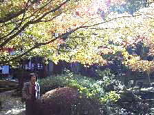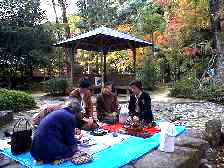 |  | 紅葉の美しいお庭で、俄かの野点が始まろうとしています。お茶の盛んなこの町ではどこかへ出かけるにもこうしてお茶の用意をしてくる人が多いのです。とっても楽しそうな年配の方々のグループでした。 |
