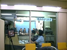 |  | いよいよ1時間番組がスタートしました。ガラスのお部屋の中がスタジオ。私たちは外の黄色い椅子の前に向き合って座って、中を見ているのですが、インターネットのリアルビデオに映った時にはクロマキーの仕掛けで、私たちがスタジオの奥に並んでいるように見えます。 ゆふいんネットがどうして始まったか、どんな楽しいことが起こってますか、なんて話が弾みました。また吉本さんはインターネット最新情報を語って下さいました。 |