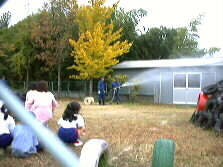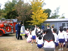 |   | すぐ前の幼稚園広場には子供たちと先生がたくさん集まっていました。早速、消防士さんが放水を始めました。勢いよく水が飛び出してきます。風に流れて来るので、みんな隅っこに逃げました。黄色く色づいたイチョウがそんな様子を見下ろしています。 |