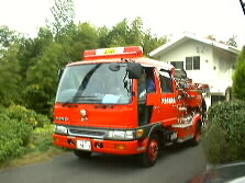 |   | 外が何だか騒がしい、、大きな赤い消防自動車が我が家の前にやってきました。ケーキを作る手を止めて、慌てて外へ出てみました。どこにも火事の様子はありません。すぐ側の幼稚園にやってきたデモ用の消防自動車でした。 |