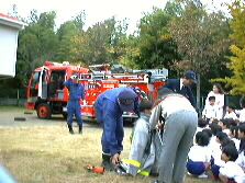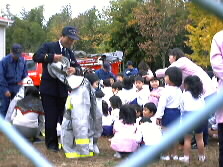 |   | 「火事の時にはあんなふうに水を飛ばして火を消すんだよ、その時にはこんな服を着ます。この服着てみたい人?」「はい、ハイ、はい!」とあっちからもこっちからも元気な声が上がります。 |