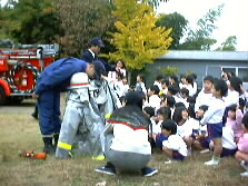 |    今度は年少さんでしょうか、着ているのがやっと、、「どうですか?」「、、、、」声も出ません。火事になった時には、大きな消防自動車で駆けつけて、そしてこんな重い服を着て、シューっと、水を飛ばして消して下さる。本当にご苦労様です。みんな火の用心をしましょうね。 | |