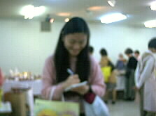 |  | お客様が会場を一杯に埋めている頃、「永野さん!」という聞きなれた声が、ナント、コアラ事務局の草本さんではありませんか。買い物を兼ねて取材に来て下さったのです。いろいろお話をしていると、「娘さんですか?」なんて聞く人がいて、ちょっとうれしくなった私でしたが、草本さんはびっくりしたことでしょうね。メモを取りながら熱心にお話を聞いて下さった草本さんです。来て下さってありがとうございました。こんな素敵なホームページを作って下さいました。 |