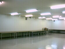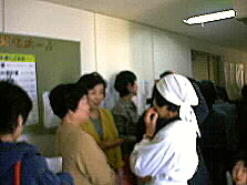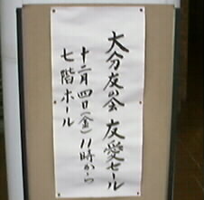 |    当日になりました。朝の8時半頃、会場の大分駅前レインボービルに行きました。すでにビルの入り口には今日の案内が出ています。7階の会場に上がりました。ガランとした大ホール、さあ、今から準備を始めます。 | |