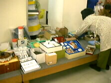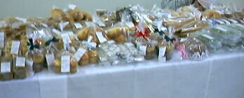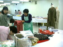 |    続々と会員が作成したお菓子や、衣の製品を持って集まってきます。お菓子は係りの者が厳しい目で点検をしていきます。焼き具合は?形は?包装は?お客様に喜んでいただけるようにと真剣な眼差しです。衣の作品も最後のチェックをします。糸は外れていないか、値札にサイズが書いてあるか、丹念にチェックをして受け取って展示をしていきます。 | |