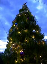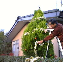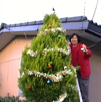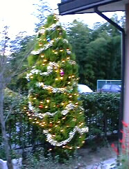 |    はい、こんな風に仕上がりました。頂上には大きな金色のお星様を飾ったのですが、ちょっと見えませんね。点灯すると、とてもきれいになりました。夕闇が迫って来ると同時にその輝きが増してきます。 | |