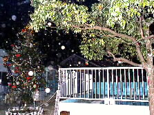 |    子供たちの打つ太鼓とともに最後の演奏が始まりました。今までにも増して速いリズムの演奏にたくさんの観客も手拍子です。赤ちゃんをだっこしたお母さんも見学です。園庭には、クリスマスツリーが美しく飾られていました。 | |