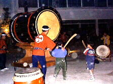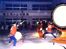 |   | 夕食の支度をしていたら、ドドンコ、ドドンコと心地よいリズムが響いてきました。野次馬大好きの私は、お鍋の火を止めて早速デジタルカメラを持って外へ、、、、 我が家のすぐ隣の富士見が丘幼稚園で和太鼓の演奏をしていました。 |