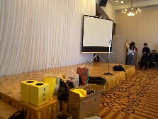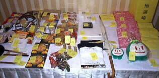 |  私もお手伝いをしなくっちゃ、、ということで、景品をきれいに並べました。フランス、アメリカ、シンガポール、マレーシア、そして国民文化祭、別府の温泉ホテルからと、国際色豊かな景品がたくさんたくさん並びました。 | |