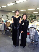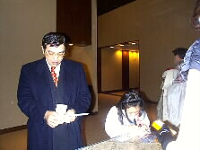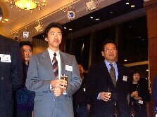 |    受付が開きました。次々に今夜の出席者の皆さんが来られます。お友達と、ご家族揃ってと、とても和やかな会になりそうです。準備の時に、ジーンス姿で現れた尾野局長もネクタイスーツ姿に変身しての登場です。小さなお客様は陶山さんご一家でしょうか? | |