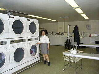 洗濯室は大きな洗濯機が11台、小さな洗濯機と言っても我が家のものより大きいですがそれが9台、そして乾燥機が14台、アイロン台が4台並んだ洗濯室です。ちゃんと乾いた物を畳むテーブルもおいてあります。これは備え付けの車付きの洗濯籠から乾燥機に入れている所です。 |
