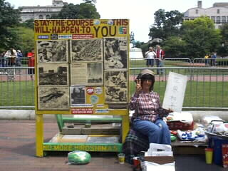 A man was appealing peace. When I turned my camera. he made a V-sign by quickly taking out a billboard in Japanese that reds "No More Hiroshima" in yellow color.