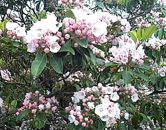 シェナンドースカイラインではこの花が道の両側に自然に一杯、咲いていて本当にきれいでした。石楠花のように見えましたが側へ寄ってみると全然違う花でマウンテン・ローレルというそうです。 |