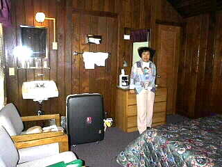 ロッジの内部です。すべて木で出来ていて雰囲気が素敵です。ダブルベッド1つ。私の後ろは鏡と整理タンス。右の扉はシャワーとトイレ、中央はクローゼットの扉です。コーヒーセットも、タオルも一杯置いてあってとっても清潔です。ここでたくさんホームページを作りましたが電話が無いので接続は出来ませんでした。 |