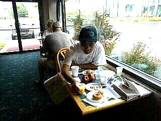 普通はモーテルでの朝食というとこんなものです。ドーナツの形をした硬いパンや甘い本物のドーナッツ、カップケーキ、それにシリアルやジュース、コーヒー。カウンターに置いてあって好きなものを取ってきて食べるという簡単な食事です。 |
