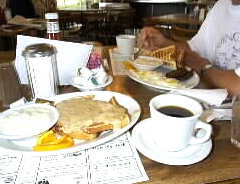 朝食です。ここの朝食はコックさんが作って出してくれる暖かい食事でした。私は「クリップド・ビーフ・グレービー」というのがトーストパンの上に乗っかったもの、白いお皿の中はオートミール。こんなの頼んだかな?というようなものが出てきてびっくり。暫くお腹にもたれてました。 |