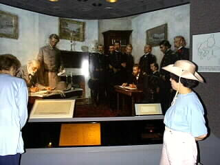 This is the place, originally the court house of Appomattox county. The building was reconstructed, but the sofa and vases on the mantelpiece are original. Other original furniture and items are preserved in National Museum of American History in Washington DC. |