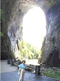Entrance ticket was $4 per adult. Passing through the paved trail along a stream, I came up to a huge stone tunnel, carved by natural force. Many benched were on the trail to enjoy the bridge. George Washington surveyed the area for Load Fairfax, and in 1774 Thomas Jefferson purchased from King George 3 the "rock bridge to ensure it was available to the public and built a two room log cabin for guests. |
