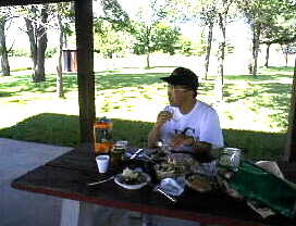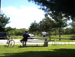 We had a lunch in a picnic atmosphere eating foods we got at a super market. It is very hot in the sunny place, but when we rest under the shed of the park, it is very refreshing and even feel cool. Today's menu is bread, orange juice, roast pork, salad, and fruit. |
