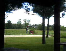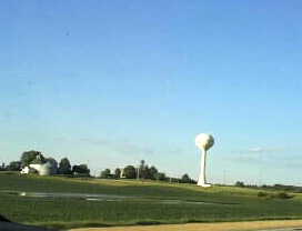 We continued to drive through green farm, tall silos, and high water tank shining under deep blue sky. We soon come up to see a place with several houses. This is called a "town." |