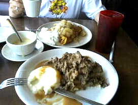 This is what we have ordered. In front of me is a dish of pancake containing apple pie (the apple came from Washington DC.) My husband's dish are hot beef sandwich and a cup of clam chowder. Whenever we eat at a restaurant, we are always satisfied with the service of the waiters. They pay attention to customers' atmosphere and ask "Everything is OK?" without fail. This time, however, we are busy to struggle with excess amount of food. You can see a T-shirt of COARA. |