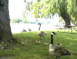 Passing down the railroad bridge, we come to a riverside park. Geese and ducks welcomed us.