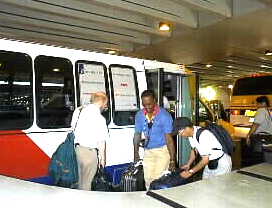 A shuttle bus of the rental car company took us to American Air line's terminal. The driver is a really powerful guy. A TV says Phoenix's temperature is 107 F. |