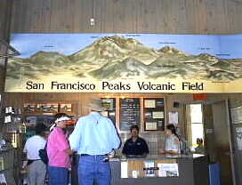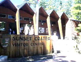 サンセット・クレーター国立公園に来ました。幹線道路からの入り口にはゲートがあって、レインジャーがいます。ここでは一人3ドルを支払ってレシートを車のフロントグラスに貼り付けておいて入場します。パーキングに車を入れるとまずビジターセンターを訪ねて、この公園の説明や展示を見てから見学に行きます。 |