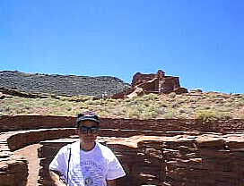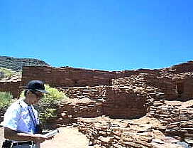 WUPATKI遺跡 Sinaguaというインデアンたちが西暦600年位から1220年くらいまでにわたって住み続けていた火山群の近くにある住居の遺跡です。見学路の入り口にボックスがあって、資料1ドルと書いてある。1ドルを入れて1冊取り出し、番号に従って説明を読みながら見学をしていきます。 |