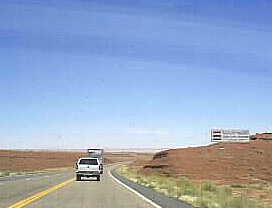 次に車はグランド・キャニオン目指して西へ走ります。途中、金網の延々と続く地域に来ました。金網の中にはポツンポツンといった感じで家が建っています。ナバホインデイアンの保護区でした。大きな看板、「ナバホの工芸品を売っています」と書いてあります。 |