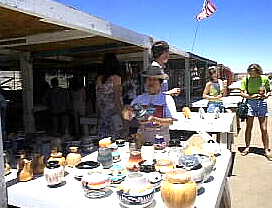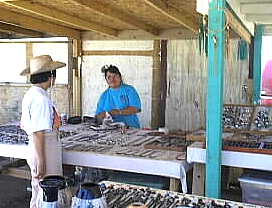 広場にたくさんの露店が並び、インデイアンの人が色々な工芸品を売っています。ペンダント、髪飾り、イヤリングなどのアクセサリー。インデイアンの人々が愛用していた魔除けなど、とてもモダンで素晴らしいデザインです。私はトルコ石のついた腕輪を買いました。 |