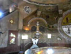 いよいよグランド・キャニオン国立公園に入りました。Desert Viewには観光用にインデイアンの砦が作られていました。インデイアンの芸術家たちによって描かれた内部の壁画です。インデイアンの人々が数代にわたって受け継いできたデザインだそうです。 |
