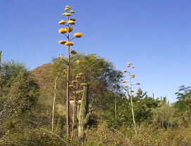 今日は朝の6時に起きて、サボテン公園へ行きました。日中は暑くなるので、この植物園は朝の7時から開いています。これはセンチュリー・プラントといいます。アパッチトレイルでたくさん咲いていましたが、一度花をつけるとこのサボテンの一生(70年)は終わります。きれいな黄金色で青い空に輝いています。 |