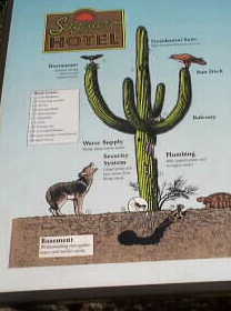 サグアロサボテンはホテルみたいです。いろんな動物がこのサボテンを拠り所に暮らしているようです。この看板には「サグアロホテル」と書いてありました。朝日のマークは有名なチェーンホテルのマークを真似ているのでしょうか? |
