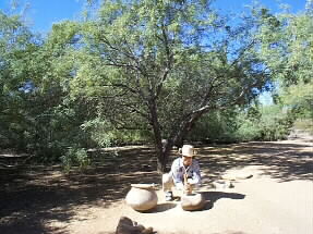 これはインデイアンの人たちの調理器具、カメの中へ収穫した豆を保存しておいて、石の臼で磨り潰して粉にして食料にします。真似事をしてみました。 |