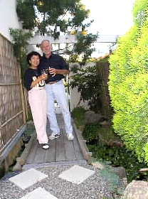 This is Jim's home. The house is located in a wonderful part of campus of UCI. At the entrance is a hand-made-pond by Jim. There are many gold fish in it. The view from the terrace is also great, looking down red roofs and high metasequoias. The temperature is dry and cool, specifically in night with chirping of insects under the bush. |